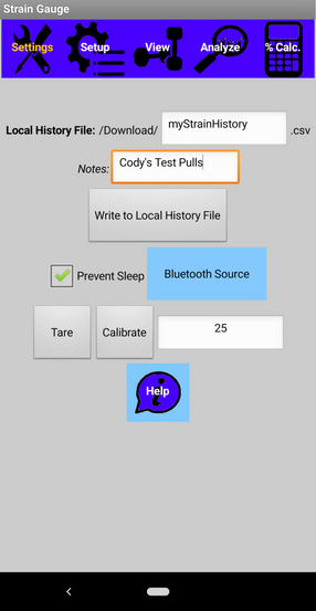 After a lot of experience with training, I added all the options/features I wanted to perform and record my workouts. The strain gauge hangs from a solid anchor with a portable hang board attached to the bottom. You can use one arm or sit and weight yourself down to anchor yourself down. There is a countdown mode with customizable protocols for how many and how long you want your reps, rests and sets to last. Use Pull Intervals allow the user to separate their pulls from the timer so it records as "working" or "resting" whenever the reading is above or below the given threshold. Warning beeps can be played in time with the countdown or at custom times. The main viewing screen has the main workout controls and shows live updates on the time, reading and interval information. The analyze screen updates with each new interval and can display a variety of statistics in a list or graph format. This allows the user to see how they're doing between sets. The interval summaries and raw data can be written to a file in the downloads directory then saved or shared from there.